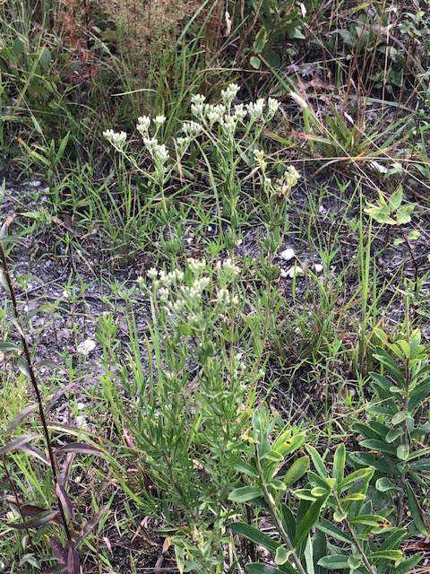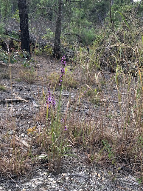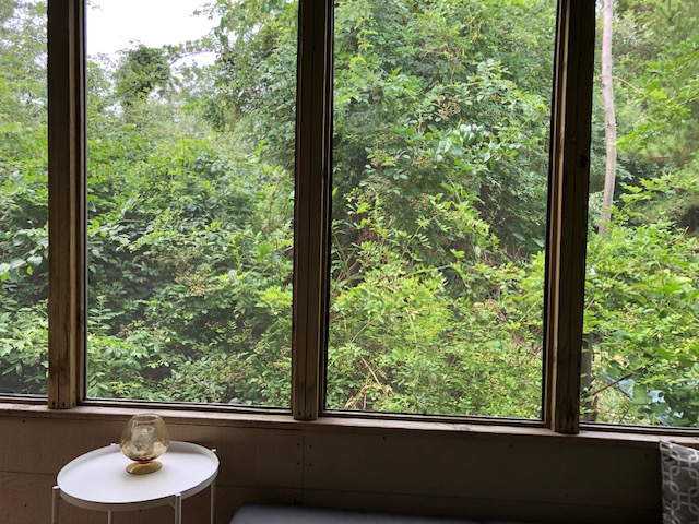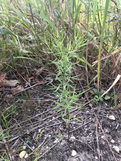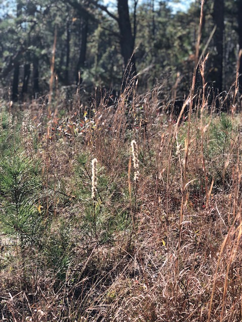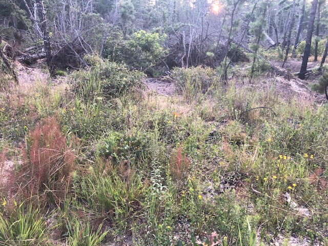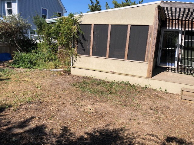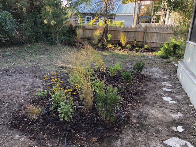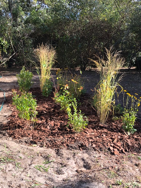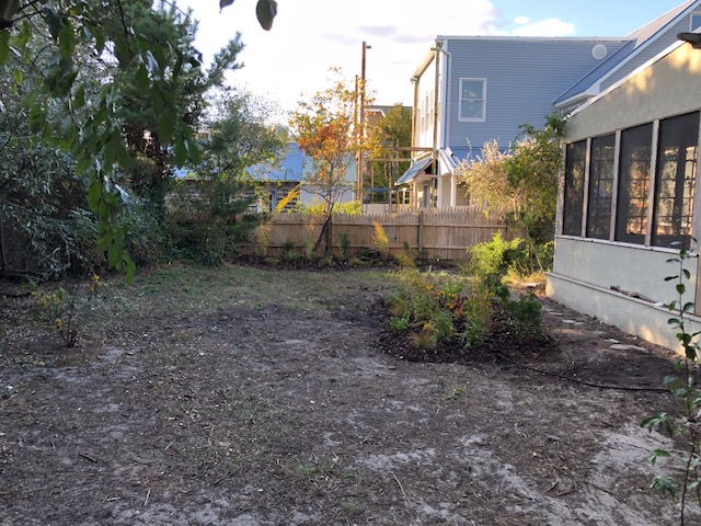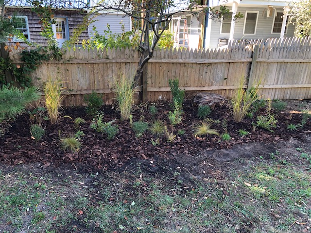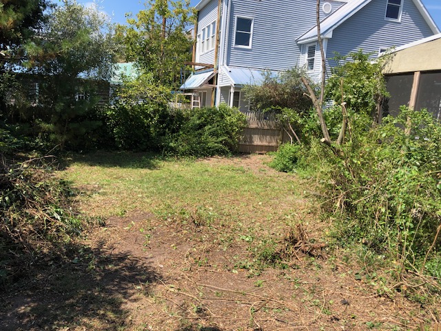 Before we began this restoration project, the client had let her yard get wild in a different way. Once she realized that all the lush foliage was from invasives!, she called us in to restore her yard to native habitat that would provide much more benefit to her beloved birds. I based part of this design on the plant community at my local park that grows in the same sandy, low nutrient, dry soil and exposed conditions as this yard. I designed the area outside the windows to lean more towards being a bird garden with plants to attract caterpillars or offer seeds and berries for food, and shrubs with branching that provide the most cover.