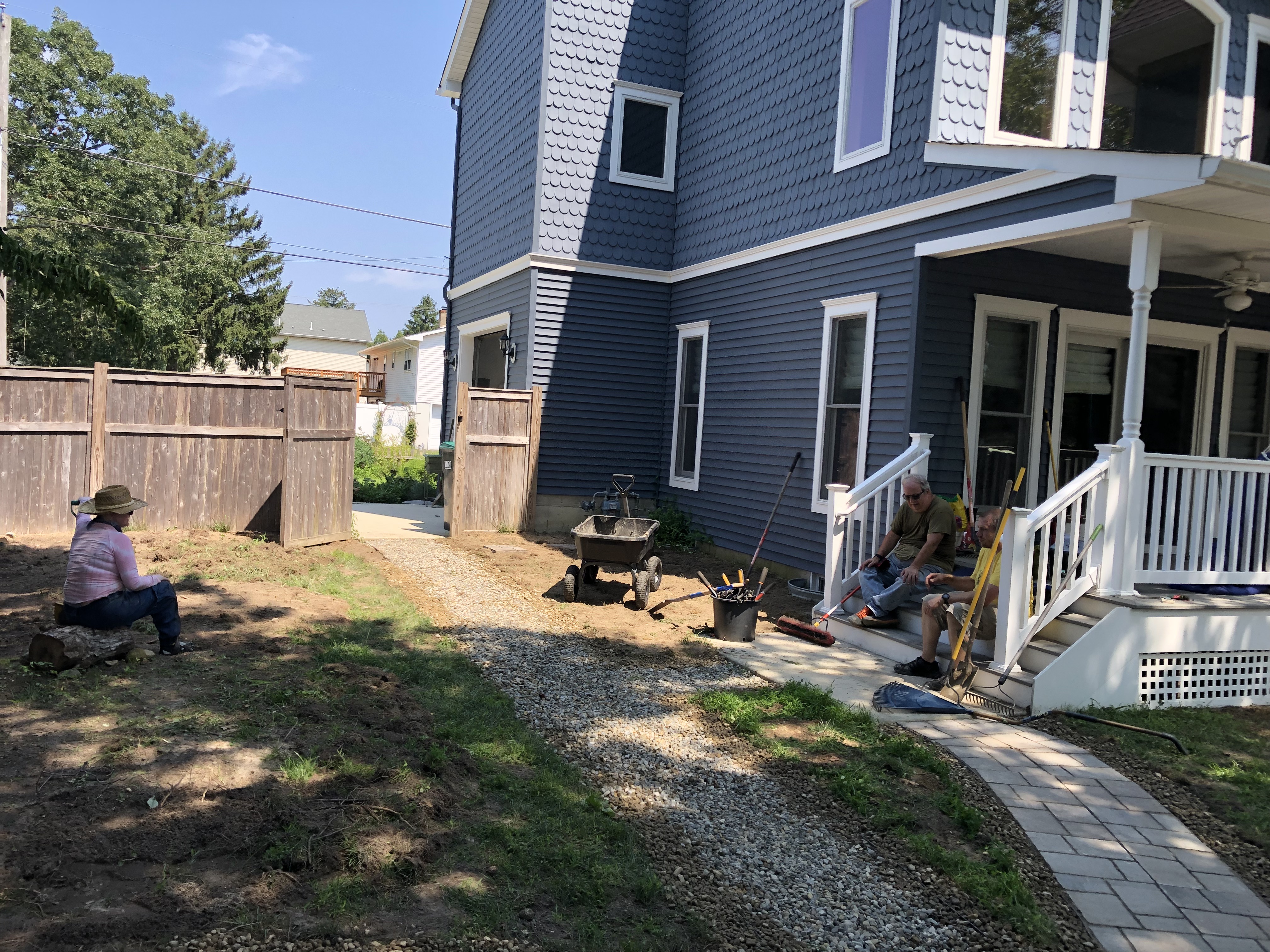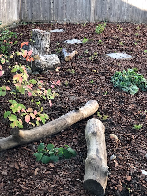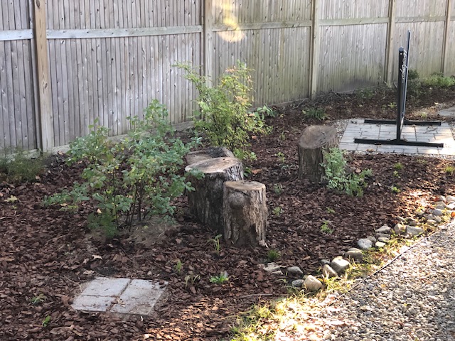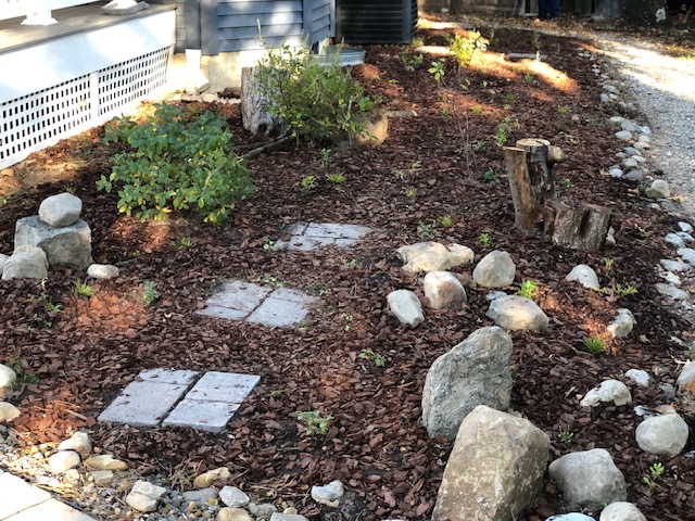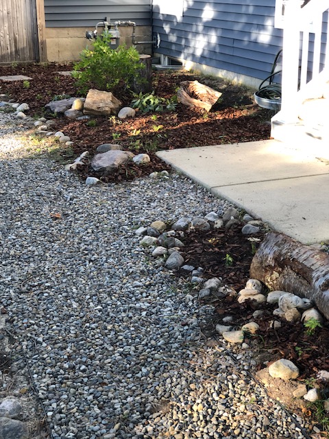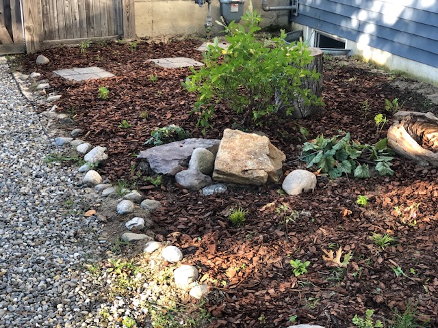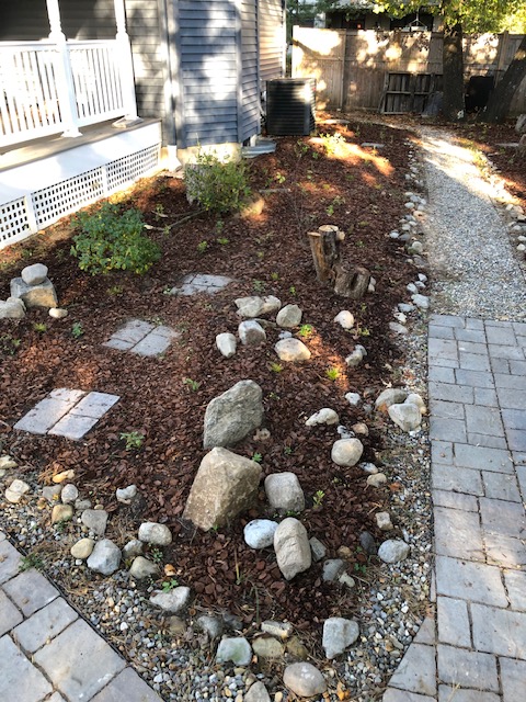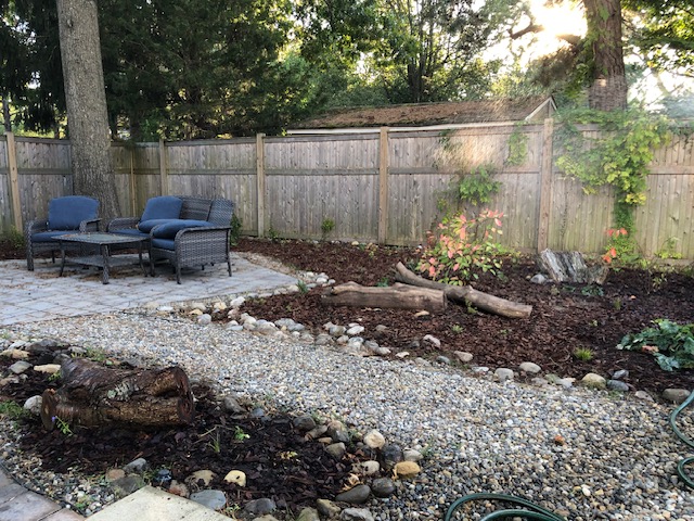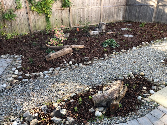 This yard was a blank slate that my awesome client told me to go wild and transform the whole thing! I modeled it after a woodland plant community I saw while camping in North Jersey. Her yard is shaded and moist so it fit well. We utilized recycled logs and rocks to create the feel of an old woodland and treated the pathways as though they represent the small stream in a forest with rocky edges. This yard is so serene and has such atmosphere when you’re there in person.