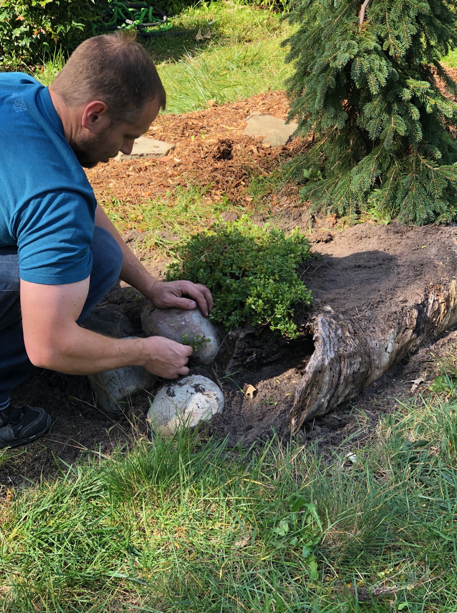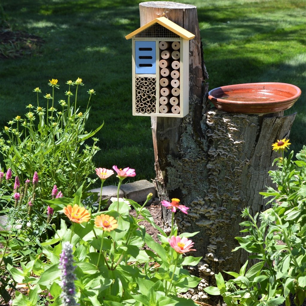 Including bug and frog hotels, trellis shelter for birds, large stones, logs, bird and bee baths…